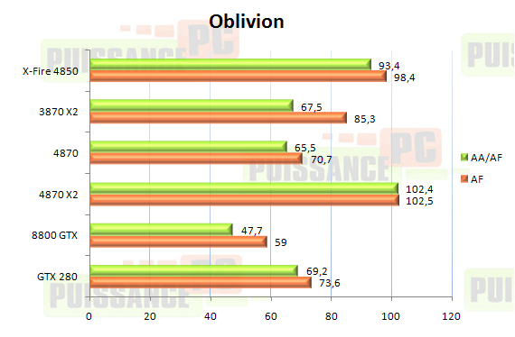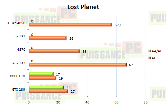 Les Radeon ont toujours apprécié ce moteur graphique, en témoigne la 4870 qui talonne la GTX280 avec et sans AA. La nouvelle venue se retrouve tout simplement limitée par le CPU avec un impact nul lors de l’application de l’AA. La 4870 X2 enterre donc la concurrence (hormis le CrossFire de 4850) en se montrant 48% plus performante que la GTX280. Un résultat très impressionnant même si en pratique le niveau de toutes les cartes testées est suffisant pour profiter parfaitement du jeu.