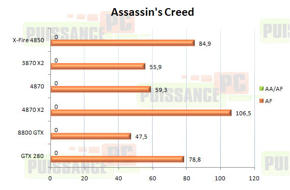 Originellement, Assassin’s Creed disposait d’un path DX10.1 permettant aux Radeon de gagner des performances de l’ordre de 20%. Depuis le patch 1.2 utilisé ici, ce mode DirectX 10.1 n’est plus fonctionnel : officiellement pour des raisons de corruption d’affichage (officieusement source de colère inaltérable pour notre Titi). A noter que sous Vista 64 bits il ne nous a pas été possible d’activé l’Anti-Aliasing et ce via le jeu ou les drivers sur Radeon comme GeForce.