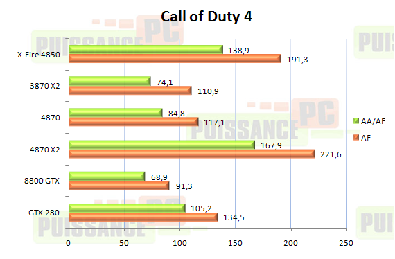 Avec un gain de près de 80% sur la Radeon 4870, notre HD 4870 X2 prend nettement les devant sur la GTX 280 qui relègue toutefois à plus de 20 images pas seconde la première nommée et se retrouve relativement proche du CrossFire de 4850. A nouveau les performances atteintes par toutes les cartes Mono-GPU sont suffisantes pour profiter du jeu détails à fond en 1920…