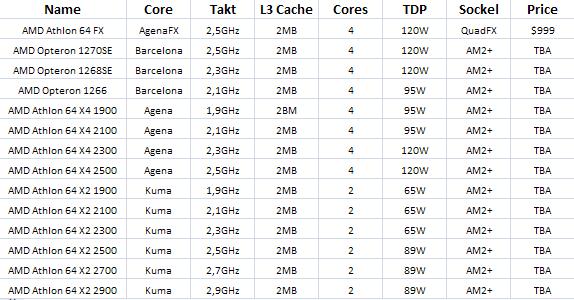 Données récupérées sur un forum allemand, voila ce qui devrait composer la gamme du remplaçant de l’actuel A64 et A64 X2. X2 et X4. Cette fois fin du Performance Rating et appellation en rapport avec la fréquence du CPU.Au menu, les X2 proposeront une fréquence maximale de 2.9 GHz alors que les X4 plafonneraont à 2.5 GHz, avec un cache L3 de 2Mo pour tout le monde, partagé entre les 2 ou 4 cores. Pas de tarif en vue, mais des nouvelles fraiches qui font plaisir à voir, preuve qu’AMD n’est pas encore entérré.
