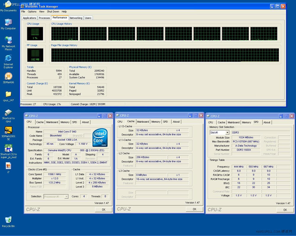 Hardspell a donc fait un screen cpuz du Bloomfield cadencé à 2.93 GHz. On peut y lire des tas de spécifications plus ou moins déja connues, comme la fréquence, la mémoire cache, les instructions supportées et bien d’autres encore. Mais c’est cette fois le nom donné à la puce qui a retenu l’attention puisque ce modèle est désigné par cpuz comme Core i7 940. A ce sujet, ce i7 940 sera accompagné par un core i7 8×0 et un i7 9×0 extreme edition, le tout sur socket 1366 et triple channel DDR3.