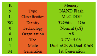 Intéressons nous d’abord aux 8 puces Samsung que l’on imagine de 4 Go (32/8 = 4, c’est qu’il y en a là dedans !). La référence est K9LBG08U1M, un petit tour sur le site de Samsung pour savoir à quoi correspondent tous ces caractères (cf image de droite). Tout n’est pas vraiment compréhensible mais il suffit de retenir que les puces utilisées sont de type Flash NAND utilisant la technologie MLC (Multi-Level Cell).