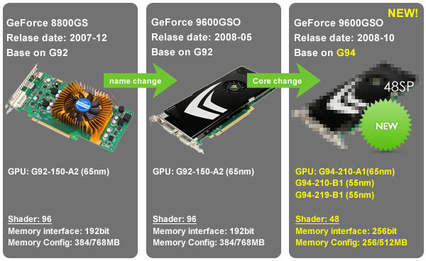 Cette décision de Nvidia va certainement à nouveau faire pleuvoir les critiques, mais donc la 9600GSO va être modifiée au cours du mois. La 9600GSO actuelle était en réalité une 8800GS renommée, basée sur un core G92 65nm castré, ne possédant plus que 96 shaders et dotée d’un bus mémoire 192bits associé à 192 ou 384Mo de GDDR3.