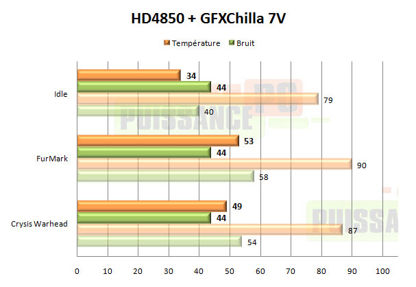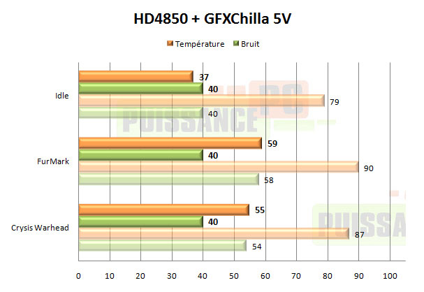 Avec la HD4850 et son refroidissement de référence très moyen, le GFXChilla l’emporte par KO technique. En 12V nous avons tout simplement obtenu 44° de mieux tant sous FurMark que Crysis Warhead, et le tout avec un niveau sonore moins élevé qui plus est ! Même en sous-voltant le GFXChilla pour le rendre totalement silencieux les gains sont énormes, en 5V c’est par exemple encore 32° de gagnés sous Warhead, avec un GFXChilla à 40dBA, pour rappel en stoppant totalement le ventilateur de la carte graphique on obtient 39dBA, c’est dire si en 5V il est silencieux.