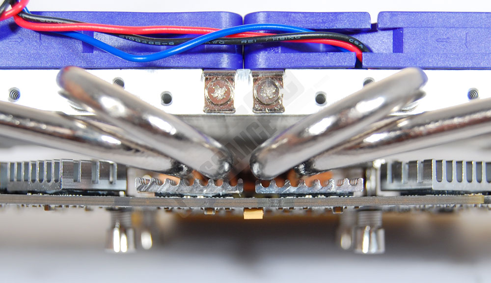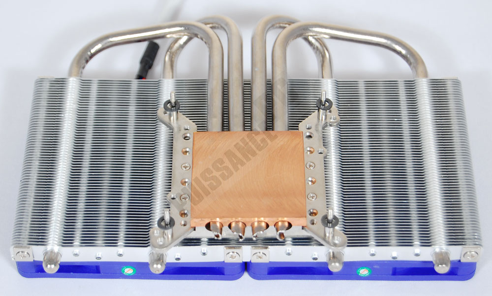 La fin du montage se déroule sans souci particulier. On place le ventirad en face des orifices, on met des rondelles en plastique et on visse les écrous à tête cruciforme sans difficulté. On remarque que le choix des radiateurs plats était indispensable tant les caloducs viennent effleurer les puces mémoire.
