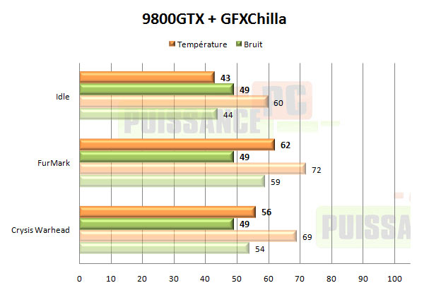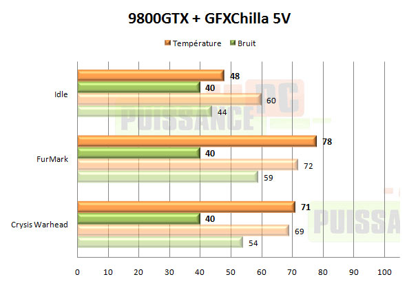 Les performances du GFXChilla sont impressionnantes sur notre 9800GTX. Même en 12V il reste d’un niveau sonore tout à fait raisonnable avec 49dBA, ce qui ne l’empêche pourtant pas de l’emporter d’une dizaine de degré sur le refroidissement d’origine, malgré une masse près de 100g inférieure ! Une fois sous-volté il conviendra même aux oreilles les plus exigeantes, tout en gardant des performances très bonnes. Ainsi même en 5V et alors qu’il devient quasi inaudible, une partie de Crysis Warhead ne fera chauffer votre 9800GTX que 2° plus que haut le refroidissement de référence, avec par contre 14dBA de moins…