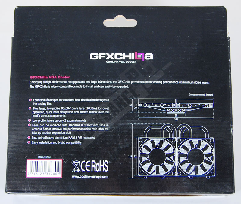 La boîte du GFXChilla ne paie pas de mine avec ses couleurs vives dans des tons rosés, rares pour ce type de produit. Au milieu Coolink laisse apparent un des arguments phares de son ventirad GPU: la présence de 2 ventilateurs de 80mm de diamètre, des ventilateurs par contre "bleu profond", là aussi un choix très particulier de Coolink qui en amusera certains et déplaira à d’autres.