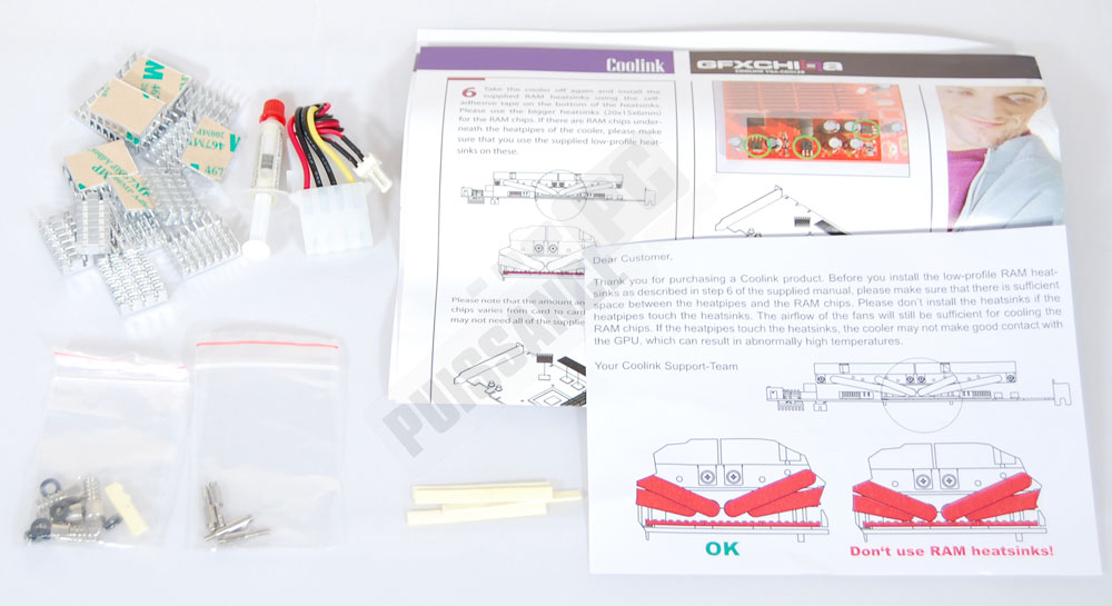 Coolink a fait un effort sur son bundle en essayant d’être prévoyant. Il y a beaucoup de radiateurs et de 3 formes différentes pour palier toutes les situations, avec même des radiateurs d’1mm d’épaisseur seulement pour d’éventuels soucis de hauteur (nous y reviendrons). On note également la présence d’un adaptateur 3 pins vers molex pour ceux qui n’auraient plus de place sur leur carte mère pour brancher le ventilateur, ou encore même de petites lamelles adhésives pour les GPU qui ne seraient pas protégés par un pourtour en dur (chose rare de nos jours). Une seringue de pâte thermique est également fournie, ce qui est toujours plus agréable que le petit sachet quasi impossible à réutiliser par la suite.
