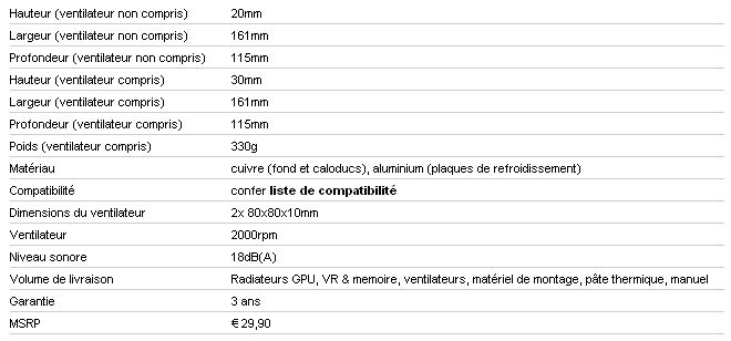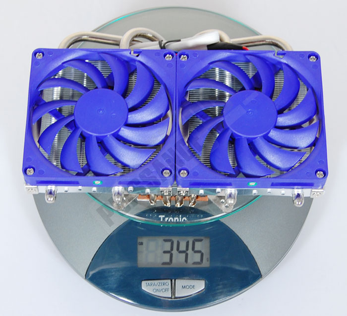 Avec 345g, ventilateurs de 80mm compris, le GFXChilla n’est vraiment pas lourd ! Il se situe à mi-chemin entre les solutions de refroidissement d’origine d’ATI et Nvidia, en restant tout de même près de 90g plus léger que le choix fait par la marque au caméléon. Sa conception en aluminium y est pour beaucoup, associée à la petitesse des ailettes qui ne font même pas 1cm de haut. Les ventilateurs avec leurs 10mm d’épaisseur permettent également de gagner en masse.