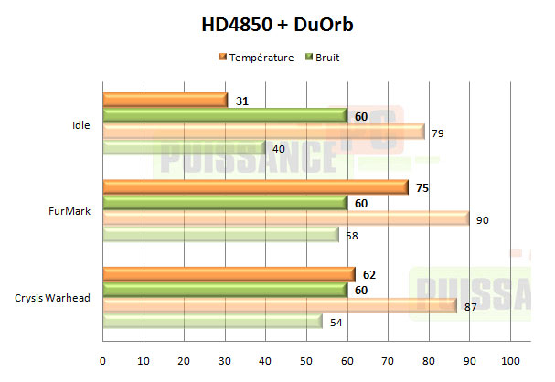 Avec la HD4850 les choses vont un peu mieux pour le DuOrb. En 12V il s’avère en charge bruyant certes, mais pas non plus beaucoup plus que la solution d’origine ATI, tout en offrant des performances sensiblement meilleures. En 5V, pour obtenir du silence, les performances sous FurMark sont plus problématiques avec un 92°, mais en jeu cela reste acceptable avec 70° sous Crysis Warhead.