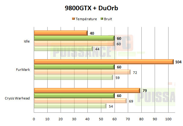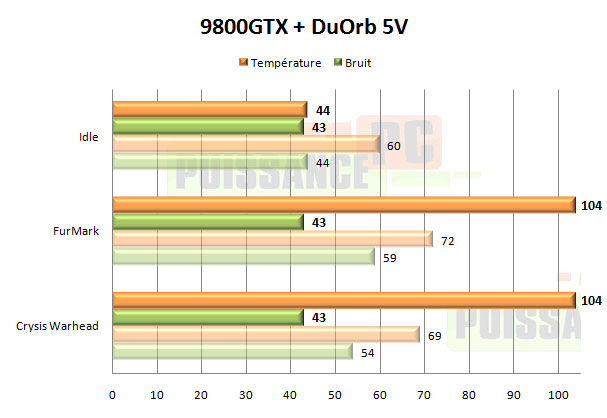 Disposant d’une alimentation de type molex, nous n’avons testé le DuOrb qu’en 12V puis 5V (en retournant la prise molex). En 12V le DuOrb affiche des performances correctes en idle… mais uniquement en idle ! Sous FurMark c’est même dès le mode 12V une catastrophe, avec la température qui s’envole jusqu’à atteindre 104°. Et encore si elle ne va pas plus loin c’est qu’à 104° le mode de sécurité thermique de la 9800GTX se met en marche, baissant les performances pour empêcher la carte de monter plus haut en température. Etrangement sous Crysis cela reste plus raisonnable avec 79°, loin de FurMark. Cependant une telle température reste une bien pâle prestation, d’autant que le DuOrb en 12V est bruyant avec 60dBA à notre sonomètre. En 5V il devient silencieux avec 43dBA, mais les performances sont alors catastrophiques, la sécurité de la carte se déclenchant à 104° aussi bien sous FurMark que Crysis.