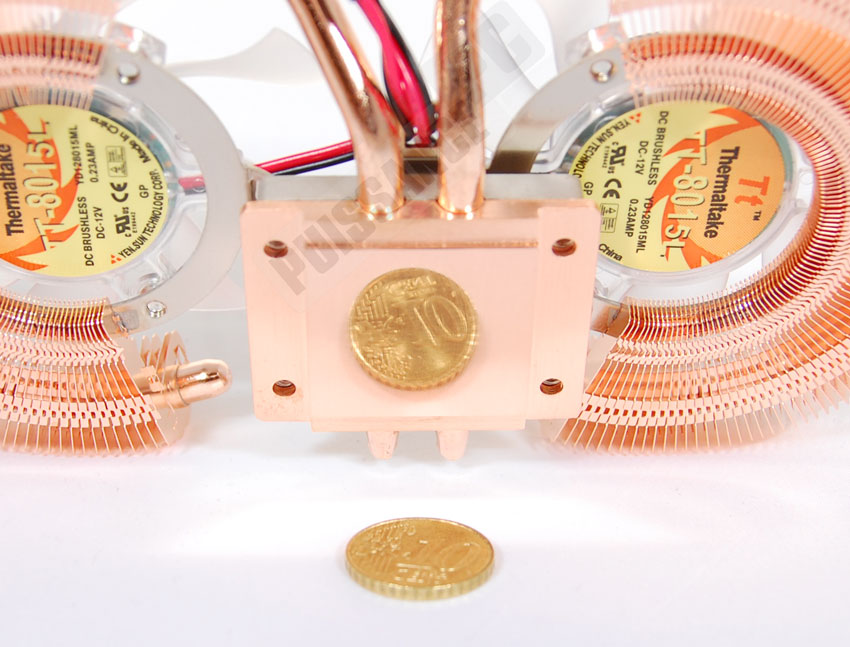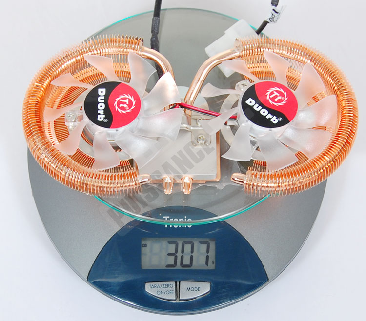 Le DuOrb est un sacré poids plume, avec au final seulement 307g sur la balance, encore moins que le chiffre officiel de Thermaltake. Une masse d’autant plus épatante que le DuOrb possède tout de même deux ventilateurs, une base en cuivre assez épaisse et des ailettes en cuivre elles aussi.