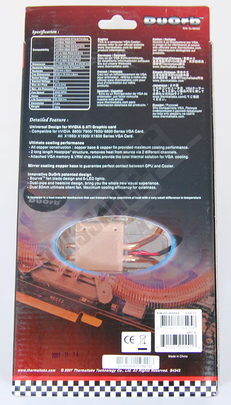 Avec la boîte du DuOrb, Thermaltake a tout misé sur le design de son nouveau modèle. Ouverture béante laissant voir entièrement le ventirad, et au cas où cela ne suffirait pas il est même encore en photo à côté, monté pour se rendre compte du résultat final. Il faut avouer que Thermaltake n’a pas tort, le DuOrb est un très beau spécimen. Espérons juste que cela ne cache pas des performances elles en retrait.