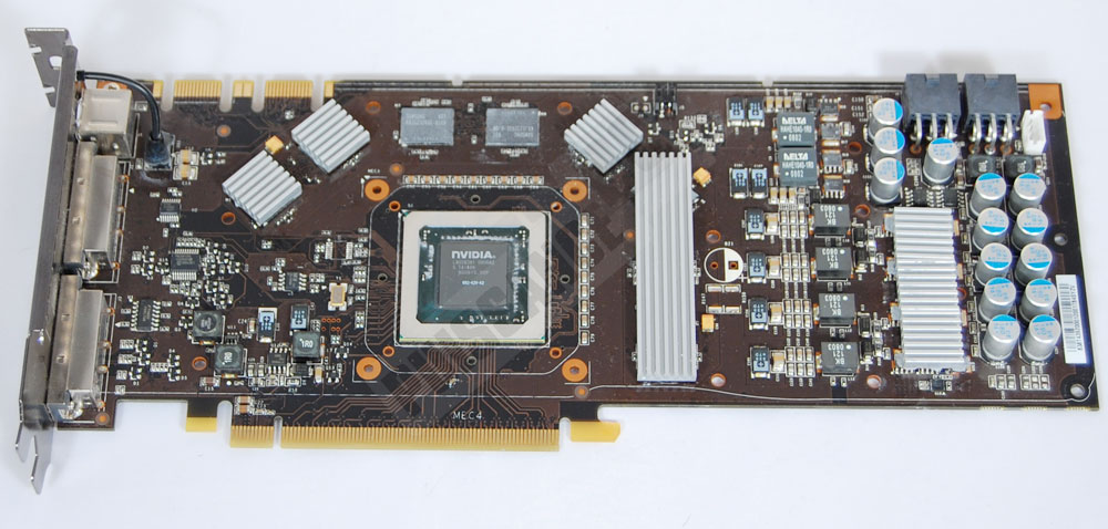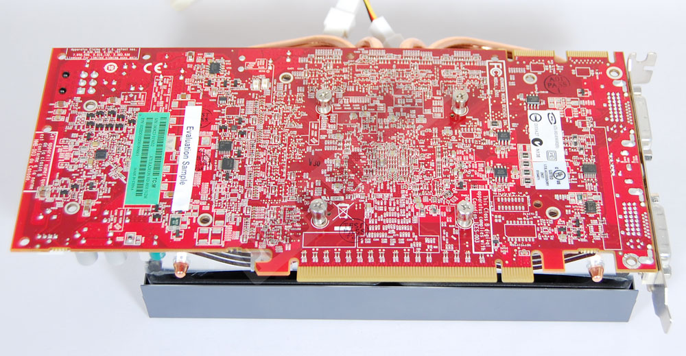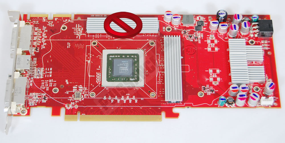 Pour la HD4850 le problème avec les radiateurs est identique bien entendu à celui rencontré avec la 9800GTX. Alors que le cliché ci-dessus illustrerait un positionnement à la fois simple et évident, il n’est finalement pas possible de placer le radiateur "barre" du haut à cause du passage des caloducs du ventirad. Résultat un refroidissement des puces mémoires "bancal", inégal d’une puce à l’autre, à se demander s’il reste un intérêt quelconque à refroidir seulement une partie des puces mémoires. Les composants de puissance doivent eux par contre absolument être couverts.