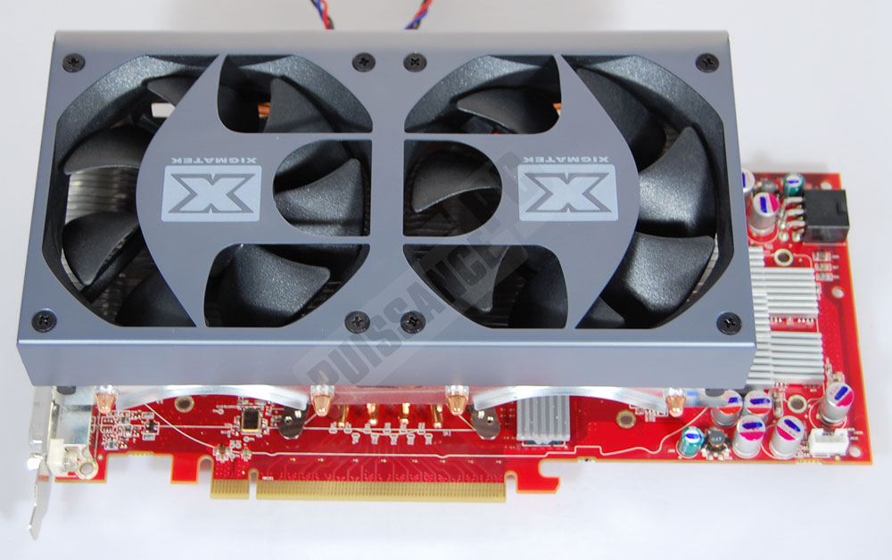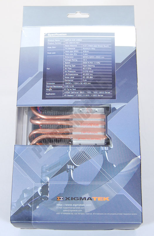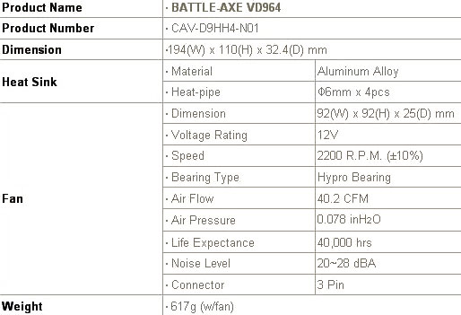 Avec ses proportions plus que généreuses, le Battle-Axe s’avère finalement un peu moins obèse que prévu avec 447g sur la balance, ventilateurs 92mm compris. C’est à peine plus par exemple que la solution de refroidissement d’origine de la 9800GTX, mais reste deux fois plus lourd tout de même que celle d’ATI.