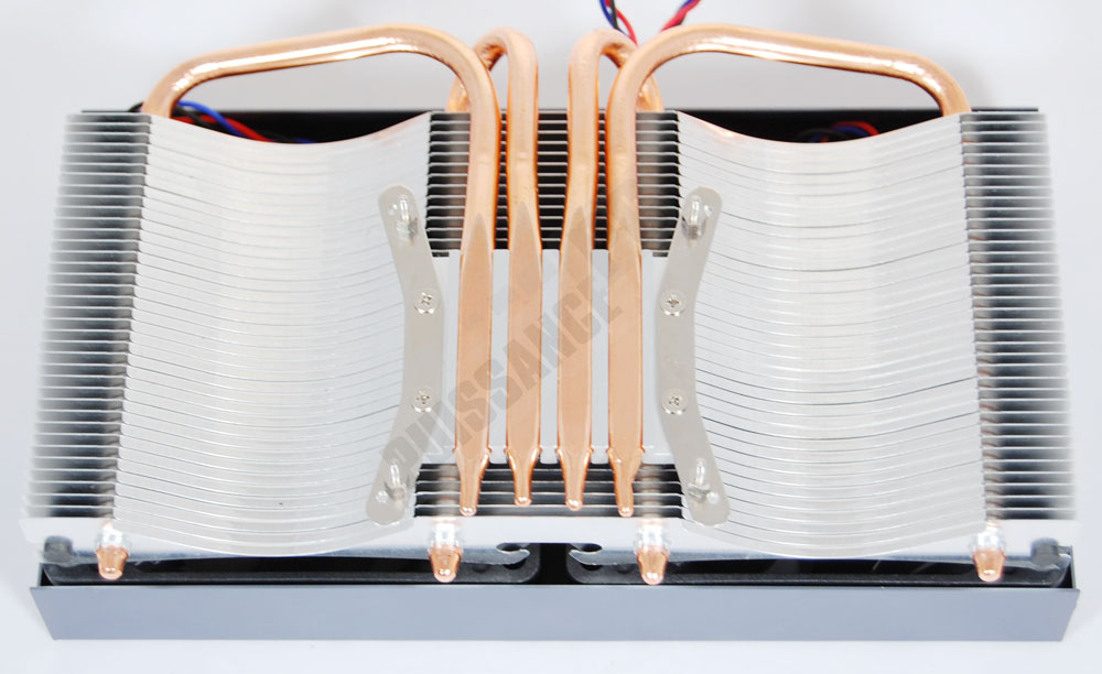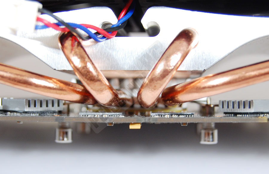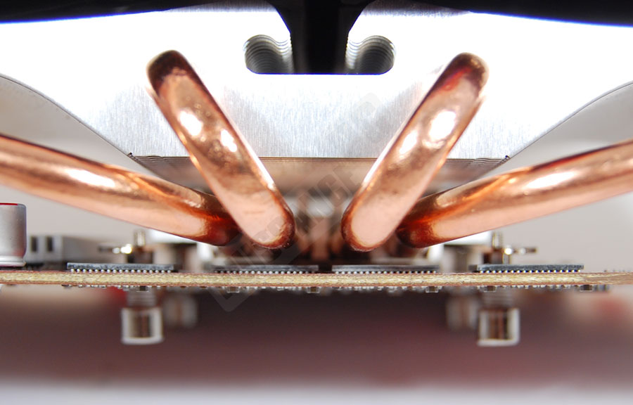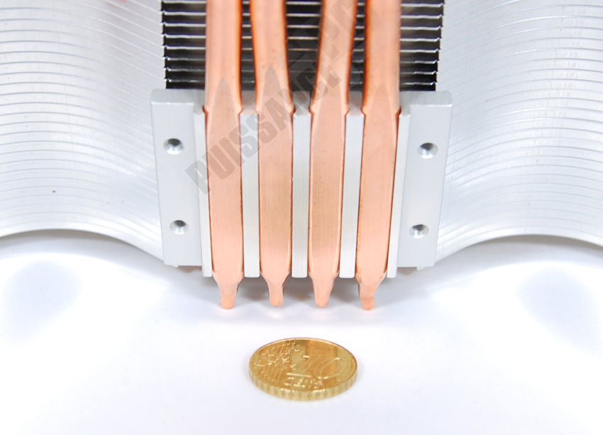La base du Battle-Axe est de type "Heatpipe Direct Touch", c’est à dire à caloducs exposés. Au nombre de 4, ils génèrent forcément un état de surface assez mauvais, le problème récurrent de cette technologie. Les pertes occasionnées sont censées être compensées par le gain apporté par le contact direct avec le GPU, mais un gros doute est permis tout de même: avec la petitesse des GPU, il semble évident que seuls 2 des 4 caloducs seront réellement en contact avec la source de chaleur, limitant alors grandement l’intérêt des 2 autres caloducs…