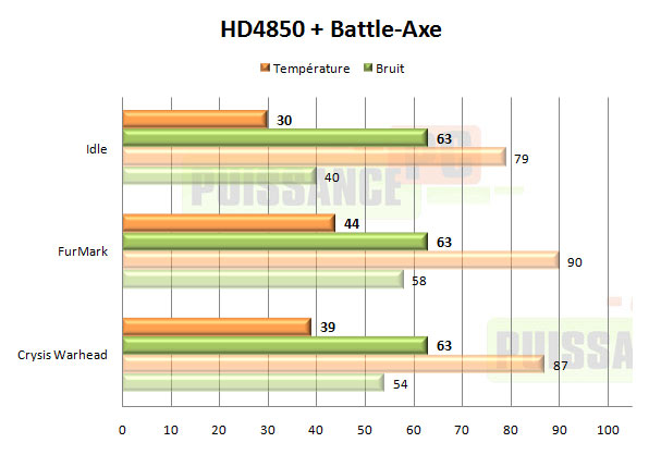 Avec la HD4850 le Battle-Axe a également des performances brutes dévastatrices. Imaginez que sous Warhead notre carte est passée de 87° avec le refroidissement d’origine à 39° avec le ventirad de Xigmatek. Une amélioration de 48° ! Tout simplement inconcevable… et pourtant. Mais là aussi tout cela se paie au niveau des oreilles, avec une intensité sonore de 63dBA quasi insupportable. Une fois sous volté le Battle-Axe reste excellent mais son rapport performances / bruit s’avère une nouvelle fois pas forcément supérieur à celui des autres très bons ventirads GPU du marché.
