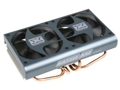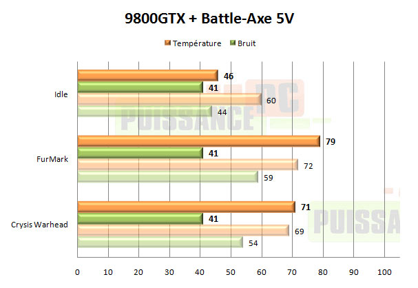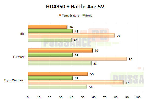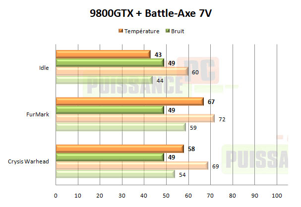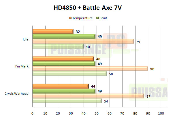 En ce qui concerne les performances brutes, il n’y a pas à redire: le Battle-Axe est assez monstrueux. On n’en attendait pas moins d’un modèle aussi imposant surmonté de 2 ventilateurs de 92mm de diamètre. Par contre en 12V ces performances sont obtenues au prix d’un niveau sonore particulièrement désagréable: 63dBA. Très peu de personnes supporteront un tel bruit d’autant que, le Battle-Axe n’étant pas thermorégulé, cela signifie 63dBA au repos également, pas uniquement en jeu. Une fois sous-volté à 7V ou 5V, les choses s’améliorent grandement pour le Battle-Axe au niveau du bruit et les performances restent tout de même très bonnes, avec par exemple 58° et 49dBA sous Crysis Warhead en 7V là où le refroidissement d’origine fait 11° moins bien tout en étant pourtant 5dBA plus bruyant. Néanmoins ces performances ne lui permettent plus alors de se distinguer d’autres bons ventirads GPU de la concurrence.