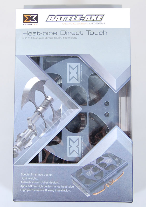 Avec ses tons gris et le ventirad peu visible, la boîte du Battle-Axe est un peu "passe-partout" et ne met pas particulièrement le produit en valeur. Le cache des ventilateurs et la hache de guerre dessinée sur la boîte tentent tout de même de donner à l’ensemble un côté un peu agressif.