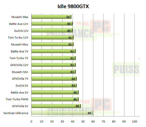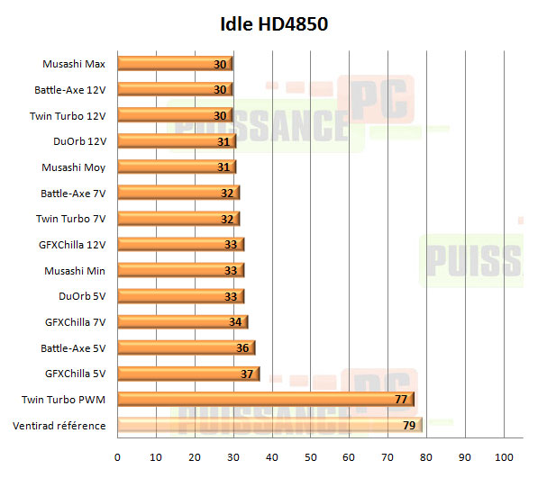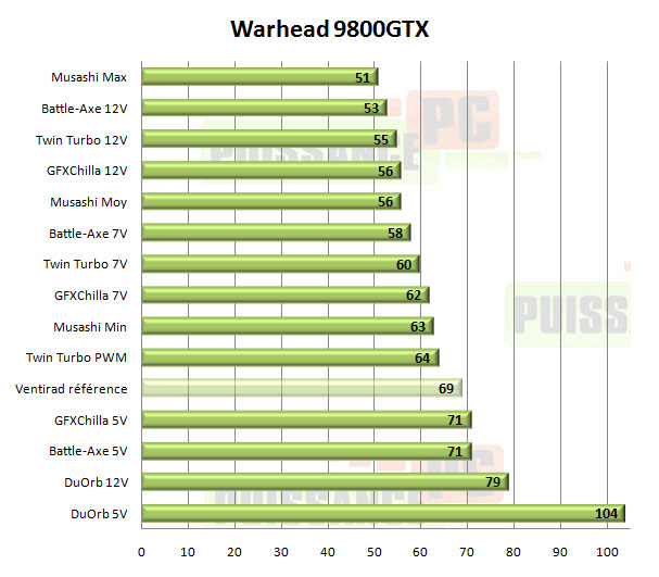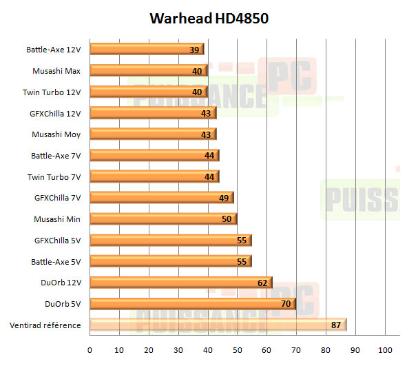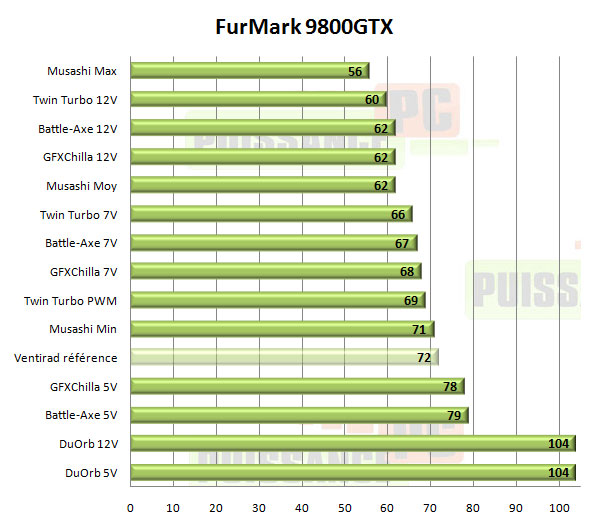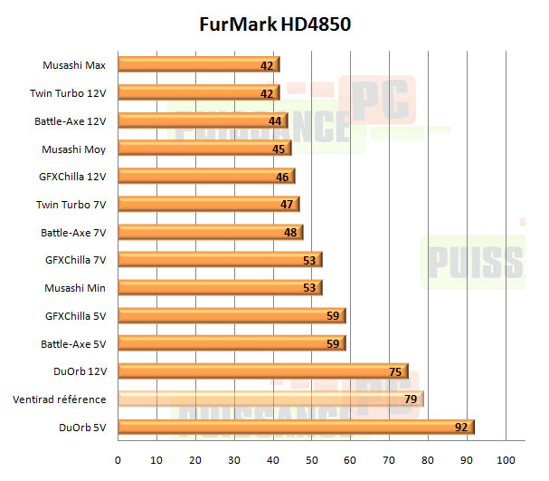 Sous FurMark les Musashi et Accelero Twin Turbo mènent la danse, mais si un vainqueur devait être désigné ce serait bien le Musashi, qui même à vitesse moyenne colle au peloton de ses concurrents… eux en 12V. A noter les performances exécrables du DuOrb, confirmées par un contre-test sur un modèle acheté dans le commerce en plus de celui envoyé par Thermaltake.