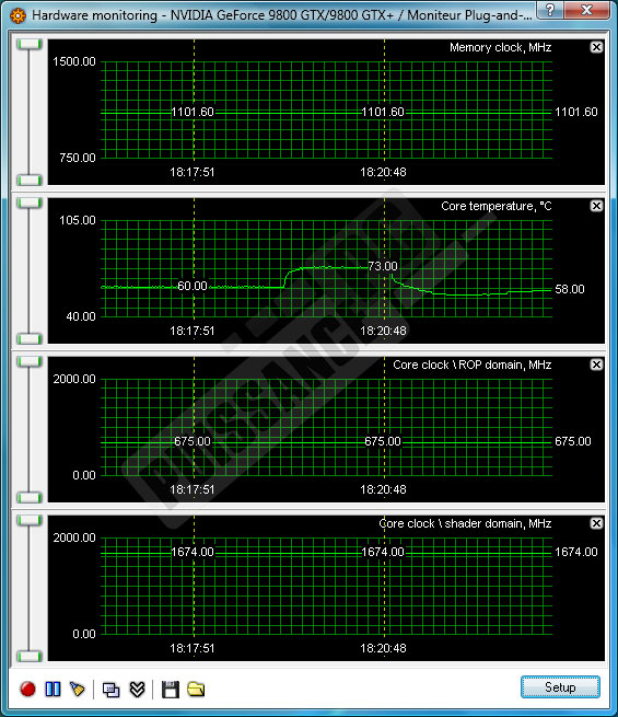 Elles seront quant à elles réalisées de manière logicielle, à l’aide du programme Rivatuner qui permet un suivi seconde après seconde de l’évolution de la température GPU par graphique avec son "Hardware monitoring". Le logiciel nous permettra également de surveiller d’autres données comme les fréquences GPU et mémoire, ou encore pour la HD4850 la charge GPU et la vitesse du ventilateur.