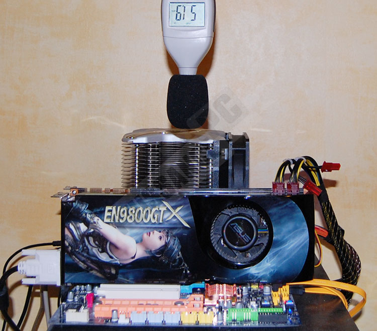 Elles seront faites à l’aide d’un sonomètre, placé perpendiculairement à la tranche supérieure de la carte graphique, à une distance de 5cm. Le niveau sonore de la pièce de test a été mesuré à 36dBA et celui au niveau de la prise de mesure, sans ventilation de la carte graphique est à 39dBA.