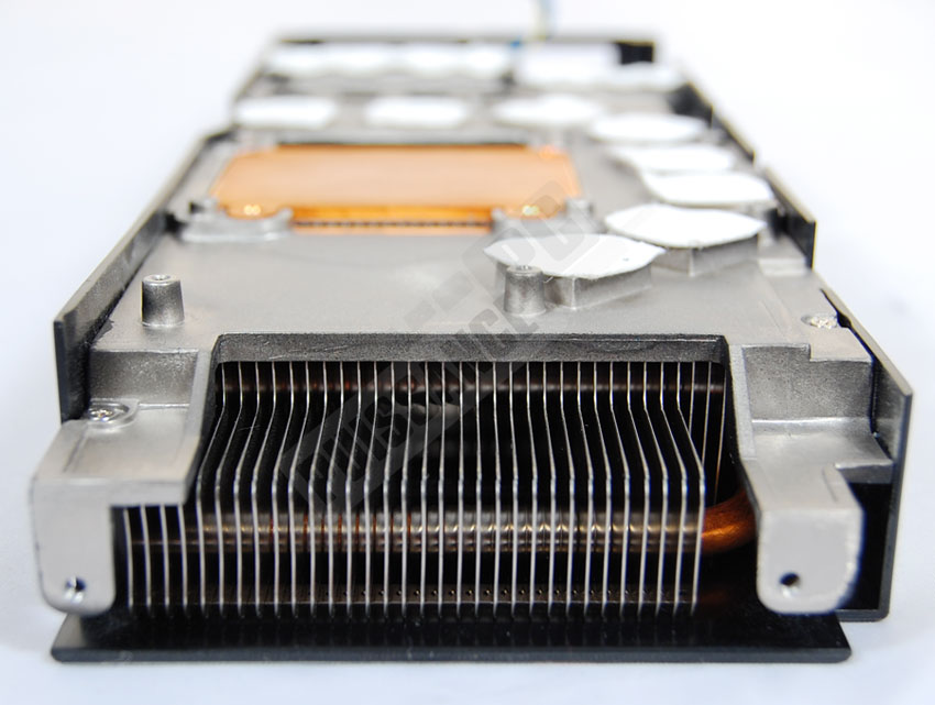 Sur la vue de côté on peut remarquer que les ailettes, bien à l’abri derrière le cache en plastique, sont traversées par des caloducs, preuve que Nvidia n’amuse pas la galerie avec son ventirad de référence, mais est bien décidé à proposer quelques chose de performant, au détriment par contre du coût de fabrication…