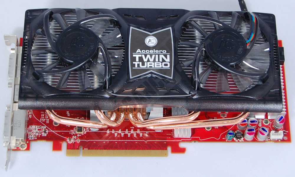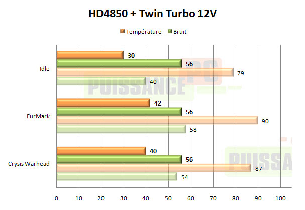 Avec la HD4850, le Twin Turbo se balade totalement en 12V et 7V, au point de rendre le mode 12V totalement sans intérêt vu le peu de gain en températures vis-à-vis par contre des nuisances sonores engendrées. On en vient même d’ailleurs à regretter l’absence d’un mode 5V sur le module, qui aurait certainement largement suffit pour cette carte et baissé encore le niveau sonore pour les fanas de silence. Une tentative alors de faire fonctionner le PWM pour gagner encore quelques décibels c’est soldé par une mise en sécurité en catastrophe de notre carte. En effet le ventilateur de la HD4850 est particulièrement sous-volté d’origine, et même lors des fortes charges 3D reste sous les 50% généralement de vitesse. Le souci est que cela ne convient pas du tout au Twin Turbo, dont les ventilateurs ne tournent tout simplement pas en 2D. Bilan 77° en idle, avec donc un radiateur passif finalement. Pourquoi pas après tout, cela pourrait convenir à certains, mais lors des benchs 3D la tension d’alimentation PWM ne monte que très peu, résultat un seul des 2 ventilateurs parvenait sur notre modèle à se lancer, et péniblement. Pas de problème malgré tout pour le GPU qui se maintenait à 82° environ, mais au bout de quelques minutes coupure systématique du signal vidéo : la carte se mettait en protection pour surchauffe des VRM…