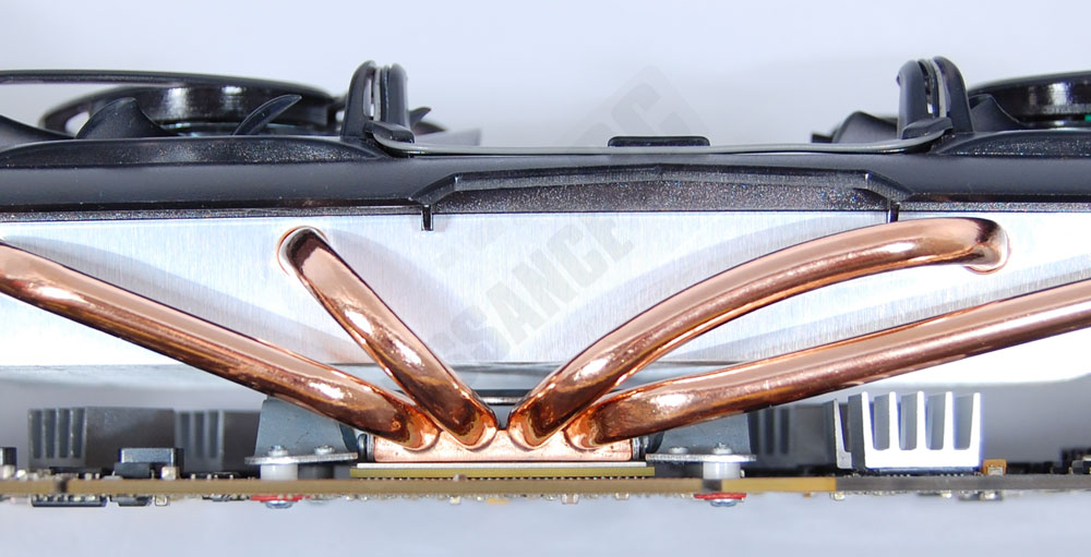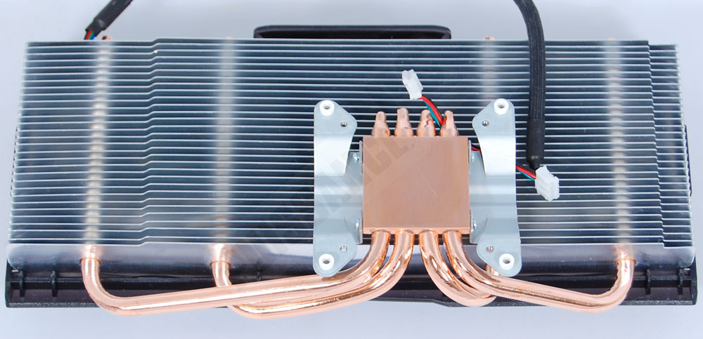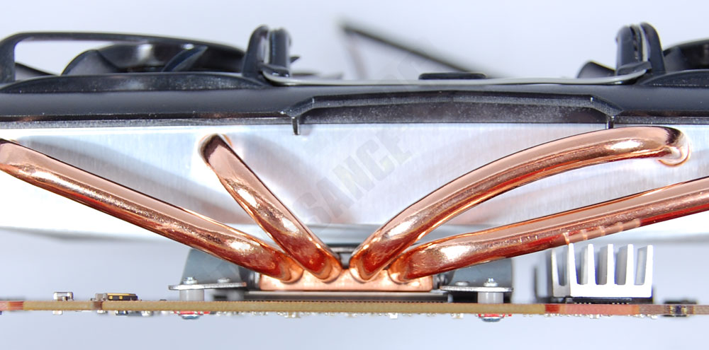 L’assemblage du ventirad en lui-même se déroule ensuite exactement comme pour la 9800GTX, avec donc un bémol : le radiateur de la dernière puce mémoire, celle en bas de la carte, est écrasé par un des caloducs… il faut pour que cela passe non pas le mettre au milieu de la puce mémoire, mais sur le côté de celle-ci (cf. le cliché ci-dessus).