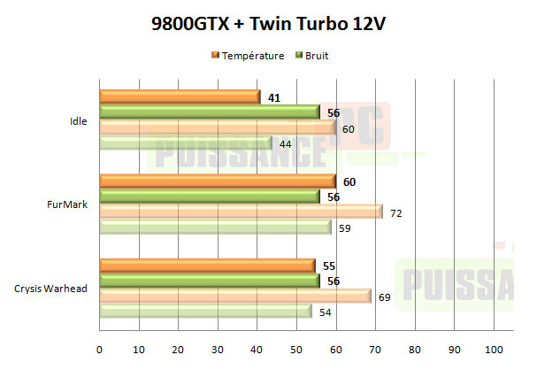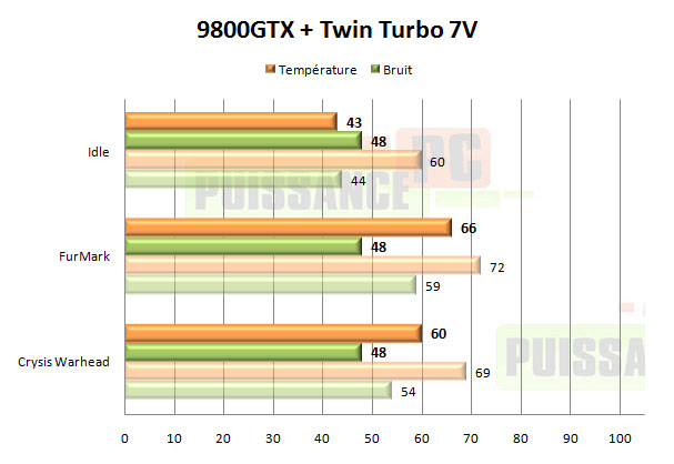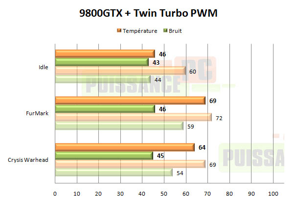 Les performances du Twin Turbo avec notre 9800GTX sont assez intéressantes. En 12V, sont intérêt en termes de nuisances sonores est à peu près nul puisqu’il s’avère aussi bruyant si ce n’est plus même. Les performances sont par contre en sa faveur avec jusqu’à 14° de mieux lors d’une partie de Crysis Warhead. Mais c’est en 7V que l’Accelero montre toutes ses possibilités, en étant cette fois-ci réellement plus silencieux que le ventirad de Nvidia, tout en étant toujours nettement devant également en performances ! Pour finir le mode PWM fonctionne bien sur cette carte, et satisfera les amateurs de silence. On gagne encore de l’ordre de 3dB en charge 3D, 5dB même au repos, avec des performances qui restent intéressantes même si elles sont alors qu’un peu meilleures que celles du refroidissement d’origine.