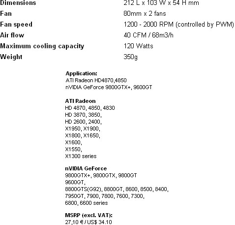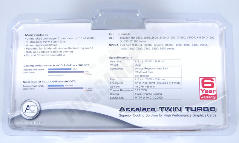 La boîte de l’Accelero Twin Turbo annonce la couleur : pas de fioriture. Un simple blister en plastique à moitié souple laissant une vue directe sur le ventirad, avec au dos quelques indications sur le produit, et c’est tout.