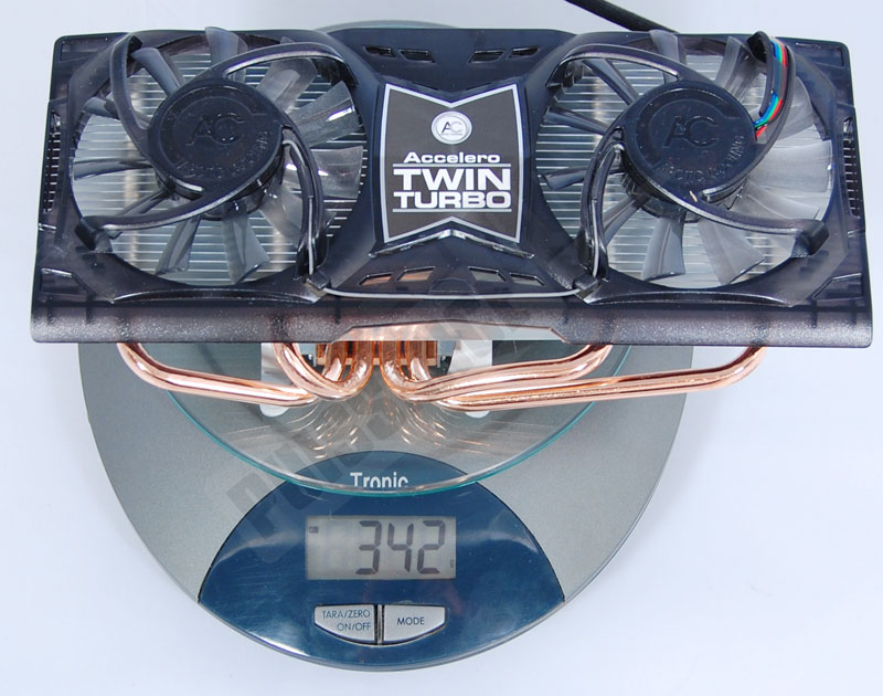 Avec 342g sur la balance, ventilateurs de 80mm compris, le Twin Turbo n’est pas bien lourd ! Il pèse en fait autant que le GFXChilla par exemple parmi nos autres ventirads alternatifs, et moins que le ventirad Nvidia pour comparer cette fois-ci à un modèle d’origine.
