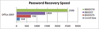 Des chiffres impressionnants, avec une récupération de mot de passe sous Office 2007 annoncée comme étant jusqu’à 15 fois plus rapide qu’avec un CPU, et même par exemple 67 fois plus rapide pour ce qui est d’un hash NTLM (mot de passe Windows Vista par exemple).