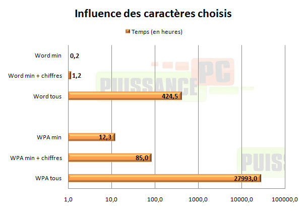 Si les caractères spéciaux (ponctuation etc…) et des espaces sont enfin inclus, même avec une chaîne ne dépassant pas 6 caractères il faut déjà plus de 17j pour trouver un mot de passe Word 2007, et… plus de 3 ans pour une passprhrase WPA !