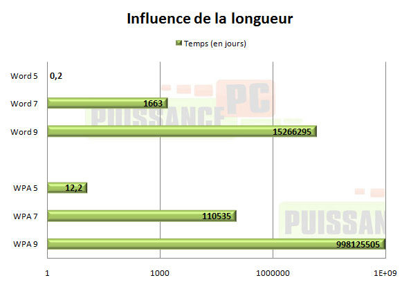 Rajoutons à cela la possibilité qu’il y ait des chiffres dans le mot de passe et la durée passe à plus d’une heure déjà pour Word 2007 et 3j13h pour notre clé WPA.
