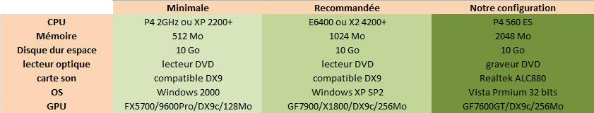 Elles sont résumées dans le tableau suivant. Elles proviennent du livret officiel du jeu, et sont relativement correctes, sauf qu’elles réclament un processeur double coeur en recommandé.