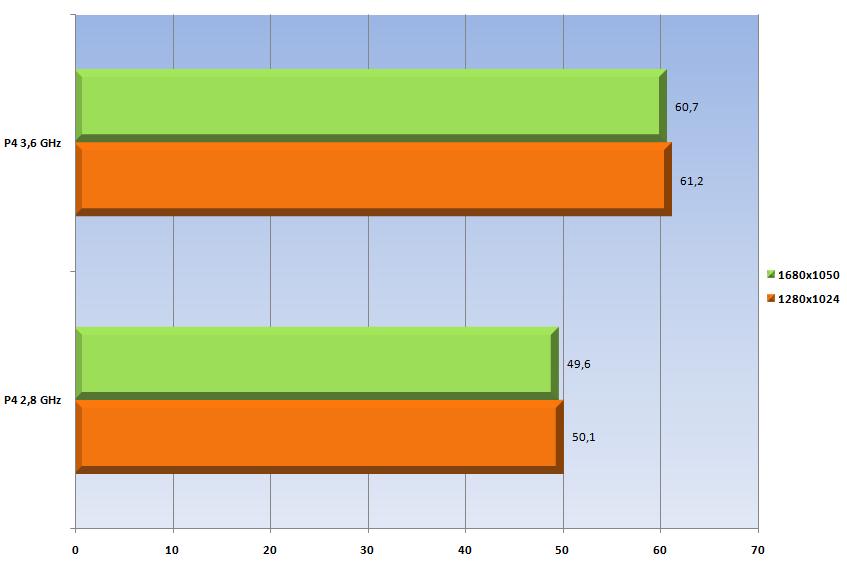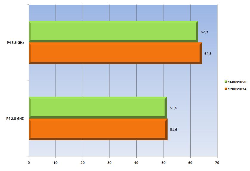 Les moyennes sont trés correctes, et les résultats permettent de jouer dans de trés bonnes conditions, les ips variant de 41 à 175 sur la scène choisie avec le P4 2.8 GHz, et de 53 à 199 avec le P4 3.6 GHz. Alors CPU limited Stalker? oui avec notre config, puisqu’un simple overclocking permet de gagner un peu plus de 20% en 1280 et à peine moins en 1680. Le gain est appréciable, et il l’est d’autant plus que la scène est chargée en personnages.