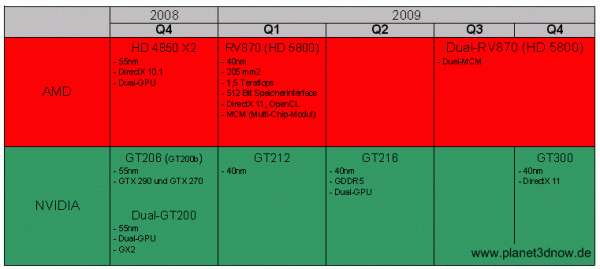 On sait bien que les gammes actuelles vont évoluer, mais cela reste encore assez flou finalement. On parle de RV870, de GT206, GT212, GT216 et GT300 sans bien pouvoir agencer dans une chronologie précise toutes ces puces. Voici un graphique de Planet3dnow qui situe bien les évènements à venir en matière de sortie de cartes. On y apprend, à supposer que ce soit vrai, que la RV870 aura un bus 512 bits, qu’Nvidia passera à la GDDR5 pour le GT216. Bref, un graphique intéressant qui semble être assez juste niveau calendrier.
