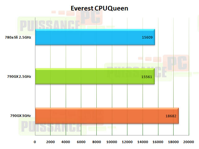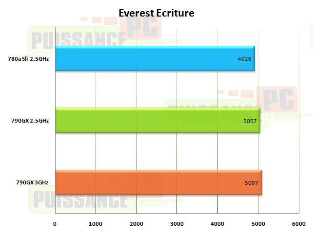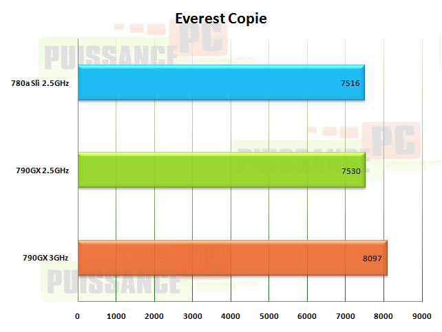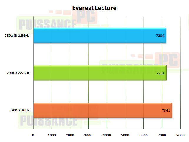 Plus la fréquence est élevée et meilleurs sont les résultats. Le Phenom à 3GHz caracole en tête du classement, tandis qu’à 2.5 GHz une énième égalité entre les deux cartes mère est à déplorer? constater? Sur les tests d’Everest, avantage tout de même au 790GX qui équipe cette carte de Gigabyte.