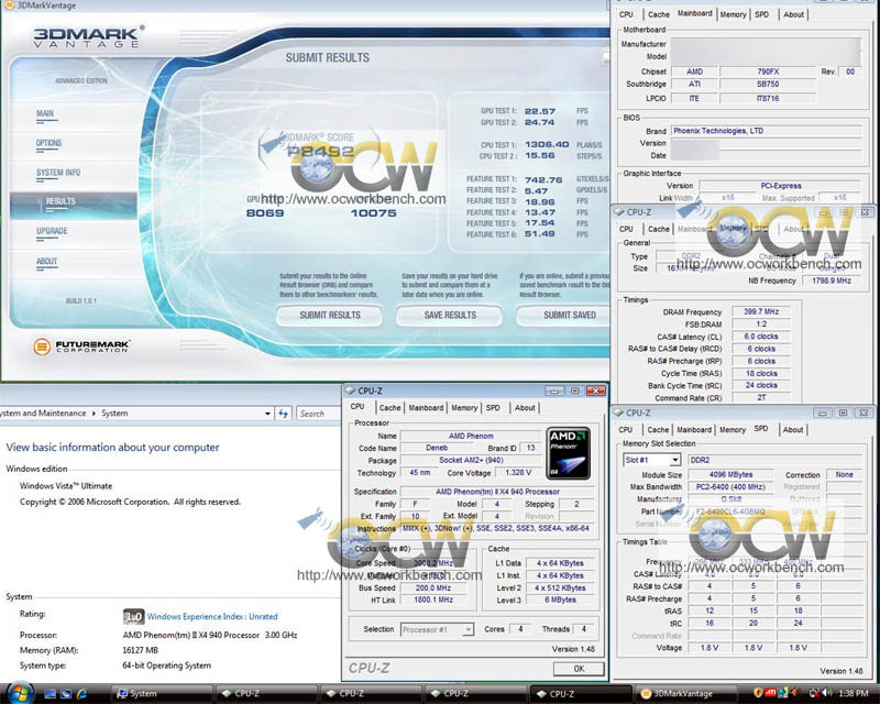 Ocworkbench a publié une capture d’écran d’un 3DMark Vantage sur un Phenom II 940. La note finale est de 8492, mais ce qui est plutôt intéressant et surtout d’emblée exploitable pour comparaison, c’est bien le score CPU. Ici il est de 10075. Pour arriver à situer les performances ici du Phenom II 940, je vous invite à comparer avec notre page de résultats sur le test Corei7 de Rycky portant sur le même test processeur. Globalement on est quasiment au niveau du Phenom 9950 overclocké à 3.2 GHz.