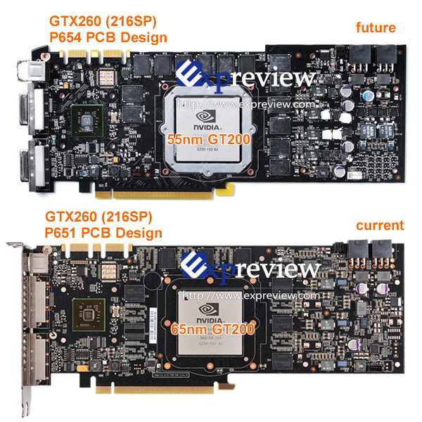 Elles étaient attendues les premières photos des cartes Nvidia GTX avec leurs puces gravées en 55nm. La première à s’offrir aux appareils photos, en l’occurrence de nos confrères d’Expreview, est le GTX260 55nm, et plus précisément le modèle Zotac, baptisé pour l’occasion GTX260². L’occasion également de constater des remaniements du PCB, avec par exemple désormais les 14 puces mémoires toutes placées sur la même face du PCB, qui passe d’ailleurs de 14 à seulement 10 couches. Voici un cliché intéressant d’une comparaison directe entre la GTX260 216SP 55nm et la version 65nm, pour plus de photos direction la news d’Expreview, avec la Zotac GTX260² sous toutes les coutures.