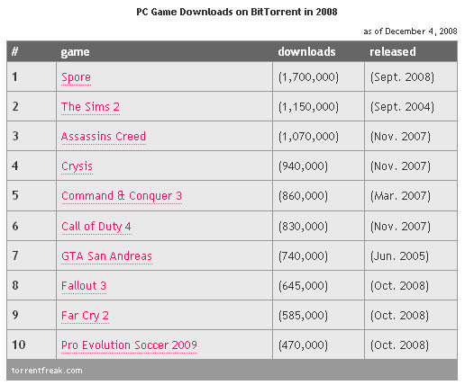 Le site Torrent Freak vient de mettre en ligne le classement des 10 jeux PC les plus piratés via torrents en 2008. Et le recordman incontesté est SPORE, d’Electronic Arts. Très contesté pour ses DRM, le jeu semble avoir convaincu une quantité énorme de joueurs de préférer le télécharger illégalement, puisqu’il est affiché à 1.7M de téléchargements illégaux, et ce alors qu’il n’a été lancé qu’en septembre. Suivent les Sims 2, toujours autant prisés, et les blockbusters comme Assassin’s Creed ou Crysis. De leurs côtés Fallout 3, Far Cry 2 et PES 2009 font une entrée remarquée aux 8, 9 et 10è places alors qu’ils viennent eux aussi tout juste de sortir.