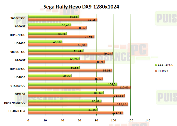 Voici un jeu qui fait presque figure d’ancien dans notre panel de test. Ce jeu DX9 est surtout impressionnant par la gestion des particules, notamment celles qui salissent les véhicules en direct live; également les déformations de la piste qui requièrent une bonne dose de shaders. Voyons donc en 1280 les résultats :