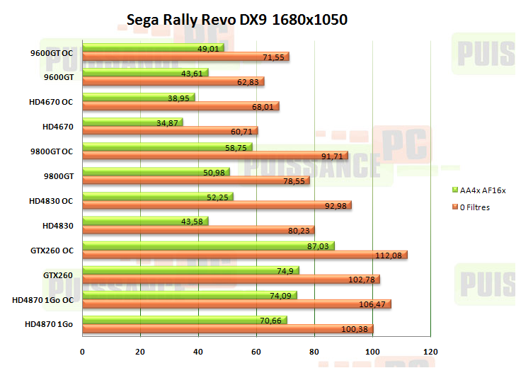Une fois de plus, on distingue 3 catégories de cartes, et toujours les mêmes via des duels intéressants. Sans filtres les cartes offrent un framerate impressionnant qui rend l’expérience de jeu concluante. La cadette des HD4000 se paye même le luxe d’être devant la 9600GT, tandis que 9800GT et HD4830 se tiennent encore dans un mouchoir de poche. Avec filtres, cette fois ci les cartes du caméléon s’en tirent mieux. Passons au 1680 :