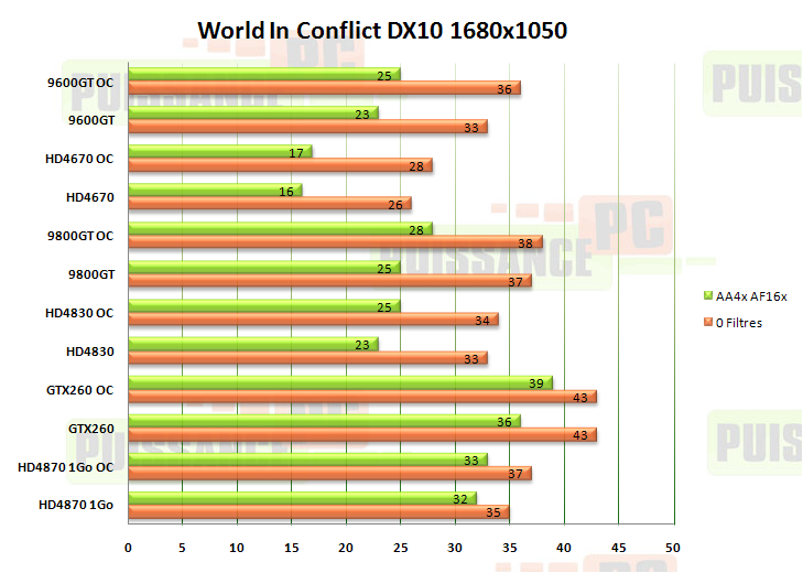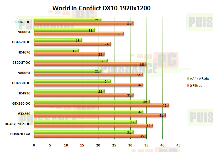 Même cas de figure, AMD derrière, sauf la HD4830 qui dépasse la 9800GT avec filtres. Il n’y a donc pas photo sur WIC, Nvidia est très au point sur ce jeu, malgré les nombreux patch déjà sortis : le programme Nvidia de co marketting et développement est plus efficace que le "get in the game" d’ATI… Du reste, toutes nos cartes permettent de profiter de ce très beau RTS, au prix parfois de quelques options graphiques pour les moins véloces.