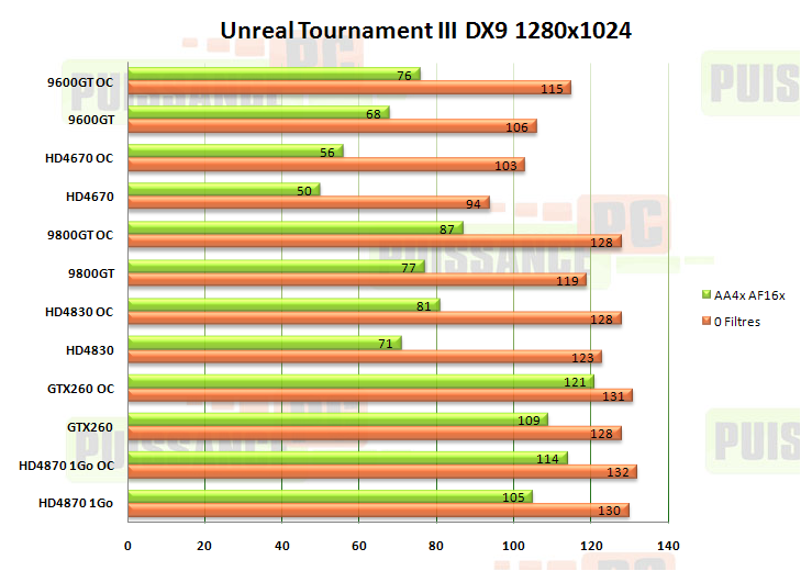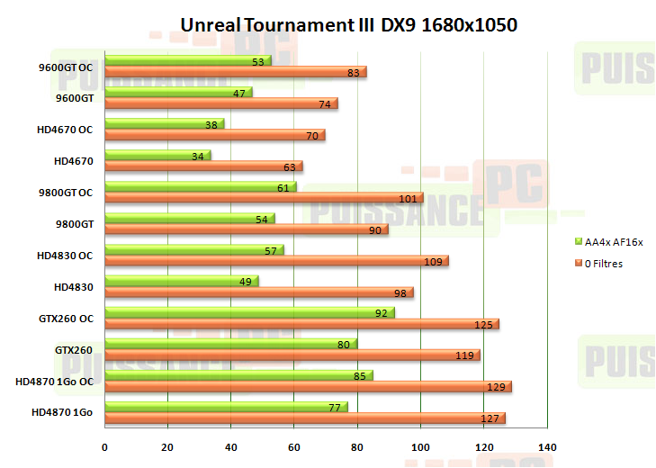 Sans filtres il semble que nous soyons limités par le Phenom à 3.2 Ghz, puisque la valeur oscille autour des 130 ips, ce qui est déjà plus que suffisant. La GTX260 et la 9800GT sont dominées par la HD4870 et la HD4830 sans filtres (sans oublier que la HD4870 est overclockée d’origine), mais dominent une fois l’antialiasing et l’anisotrope activés. La HD4670 déjà est en difficultés face à la 9600GT, mais n’empêche pas de jouer avec filtres malgré son retard. Voyons en 1680×1050 :