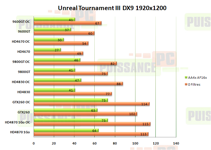 Même hiérarchie, avec les 9800GT/GTX260 devant avec filtres et derrière sans. Dores et déjà la HD4670 avec filtres en 1680, il faut oublier, et la 9600GT commence à marquer le pas quand même, tout en étant 20% plus rapide que la HD4670 dans ce mode précis. Et en 1920×1200 ?