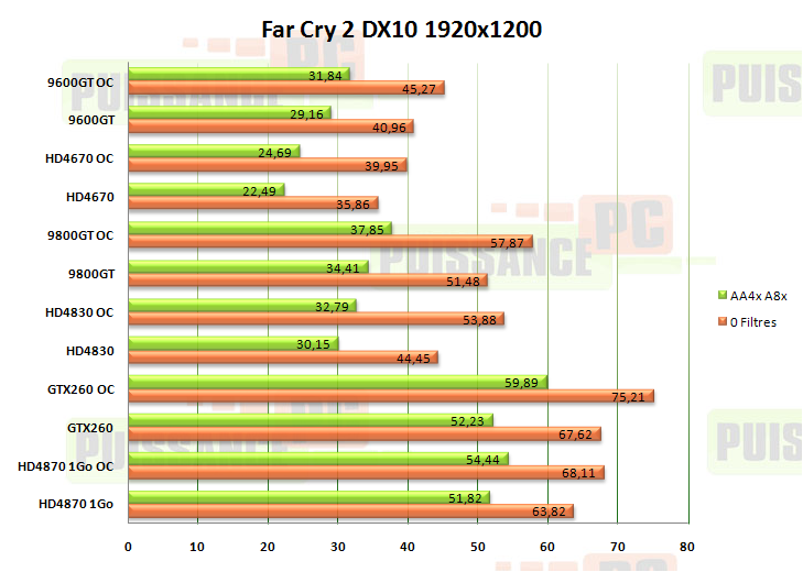 Voici la "suite" de Far Cry, qui n’est pas développé par le même studio, mais distribué sous le même giron! Le graphisme de Far Cry 2 est clairement en avance sur l’intelligence artificielle des protagonistes, qui n’est pas vraiment un modèle du genre. Les réglages sont tous paramétrés High, et en DX10; les sessions sont réalisées avec le benchmark intégré sur la carte de jeu la plus longue : ‘Ranch long" (elle porte bien son nom, n’est ce pas ?).