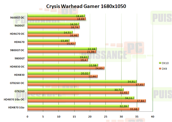 La HD4670 est derrière la 9600GT, de très peu, mais ne permet en aucun cas de jouer sur ces deux cartes. Les HD4800 sont devant les cartes du géant vert (HO HO HO), que ce soit en DX10 ou DX9. Ce résultat sera-t-il confirmé en 1680 ?