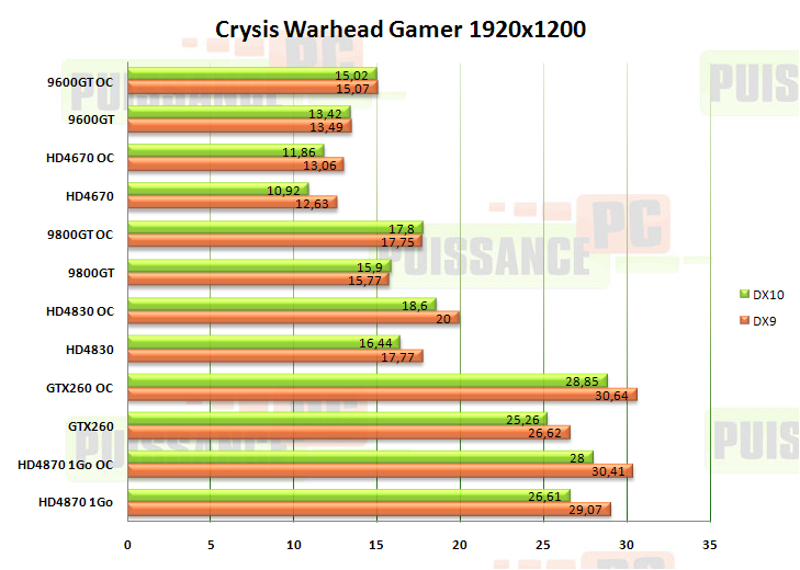 Finalement les cartes AMD sauf la HD4670 sont devant leurs ennemies Nvidia. Alors que Crysis 1 était plutôt favorable aux cartes du caméléon, Warhead lui rétablit un peu l’équité que souhaite tout joueur : avoir des performances identiques quel que soit le développeur et son affinité avec le constructeur de GPUs (une belle utopie ?). La HD4870 étant d’usine overclockée, ses résultats sont de peu supérieurs à la GTX260, mais n’auraient de toute façon pas bien loin aux fréquences de base de toute HD4870, tellement on peut dire que l’overclocking ne booste pas beaucoup cette carte.